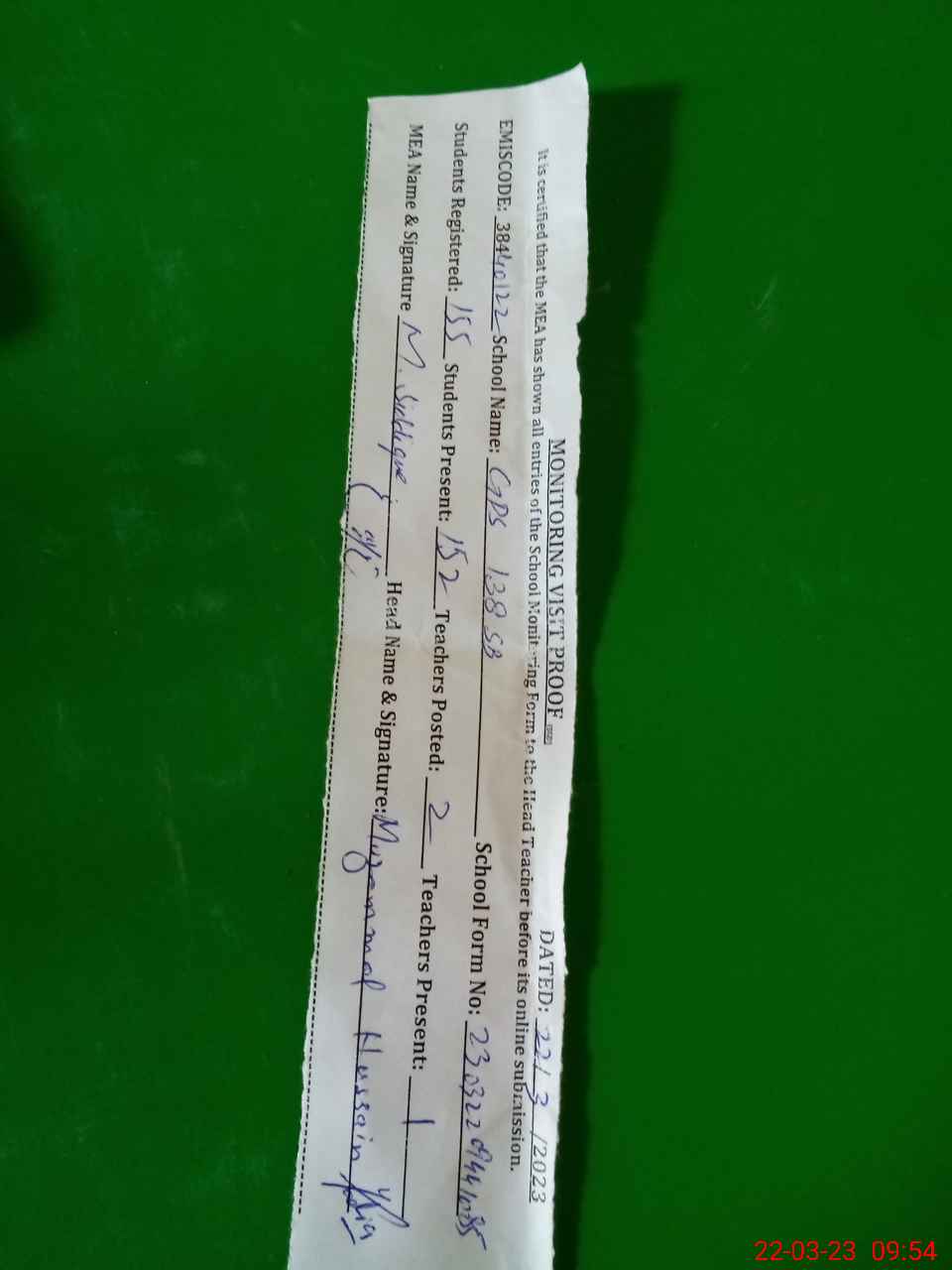 | Attendance Register | Head Teacher | MEA with School | Visit Proof |