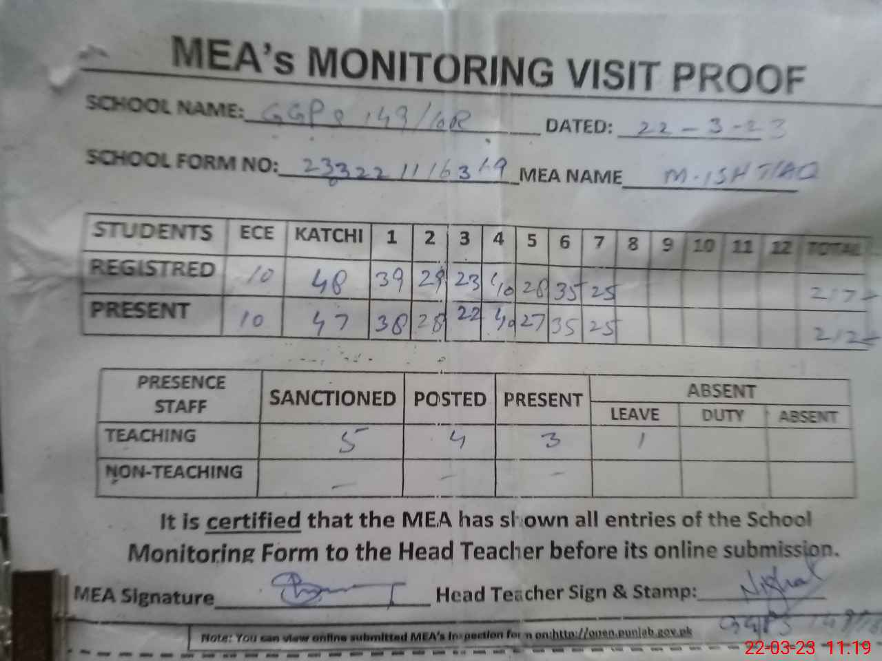 | Monitoring Date: 22-03-2023 | Start Time: 22-03-2023 11:03 AM | End Time: 22-03-2023 11:46 AM | Name of MEA: M.Is**** (S**** 03**** | |