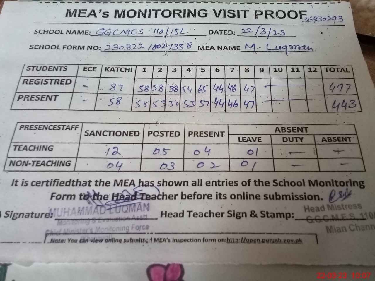 | Certified that this School was Inspected by the Undersigned MEA/DMO Today and the Information Stated Above is as Per Record. | |||||