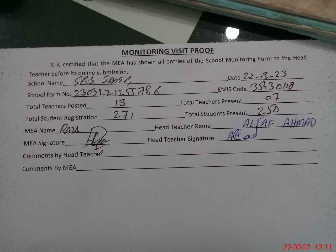 | Attendance Register | Head Teacher | MEA with School | Visit Proof |