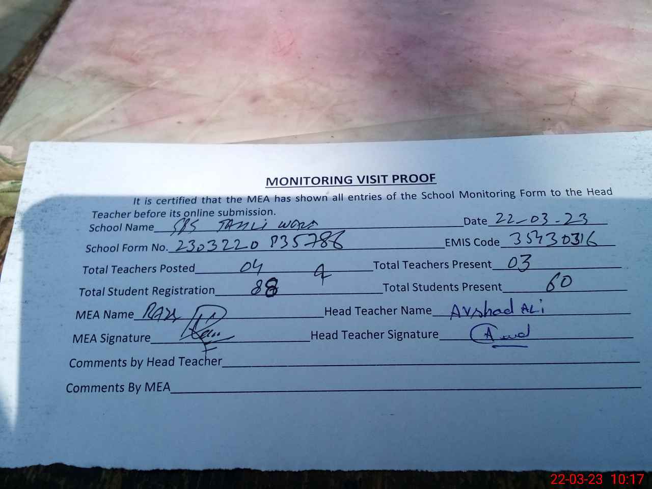 | Attendance Register | Head Teacher | MEA with School | Visit Proof |