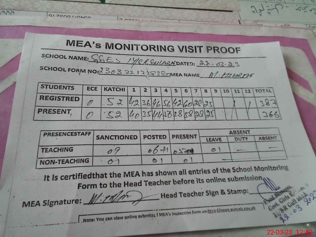 | Attendance Register | Head Teacher | MEA with School | Visit Proof |