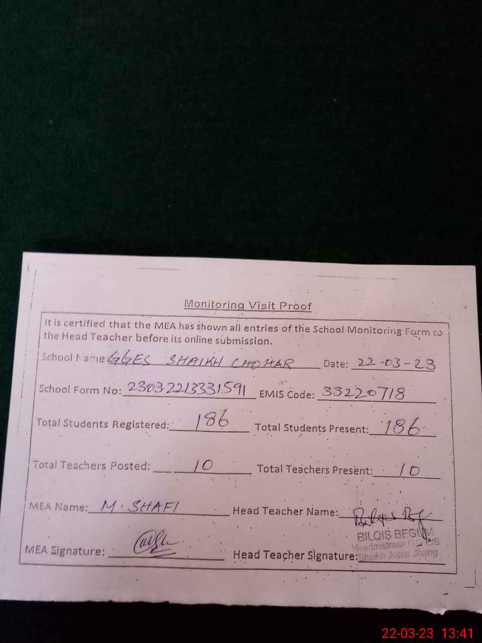 | Certified that this School was Inspected by the Undersigned MEA/DMO Today and the Information Stated Above is as Per Record. | |||||