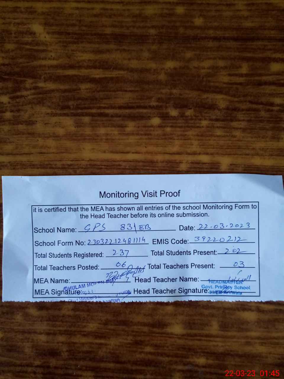 | Monitoring Date: 22-03-2023 | Start Time: 22-03-2023 12:48 AM | End Time: 22-03-2023 01:45 AM | Name of MEA: Gh**** Mu**** Mu**** (R**** | |
