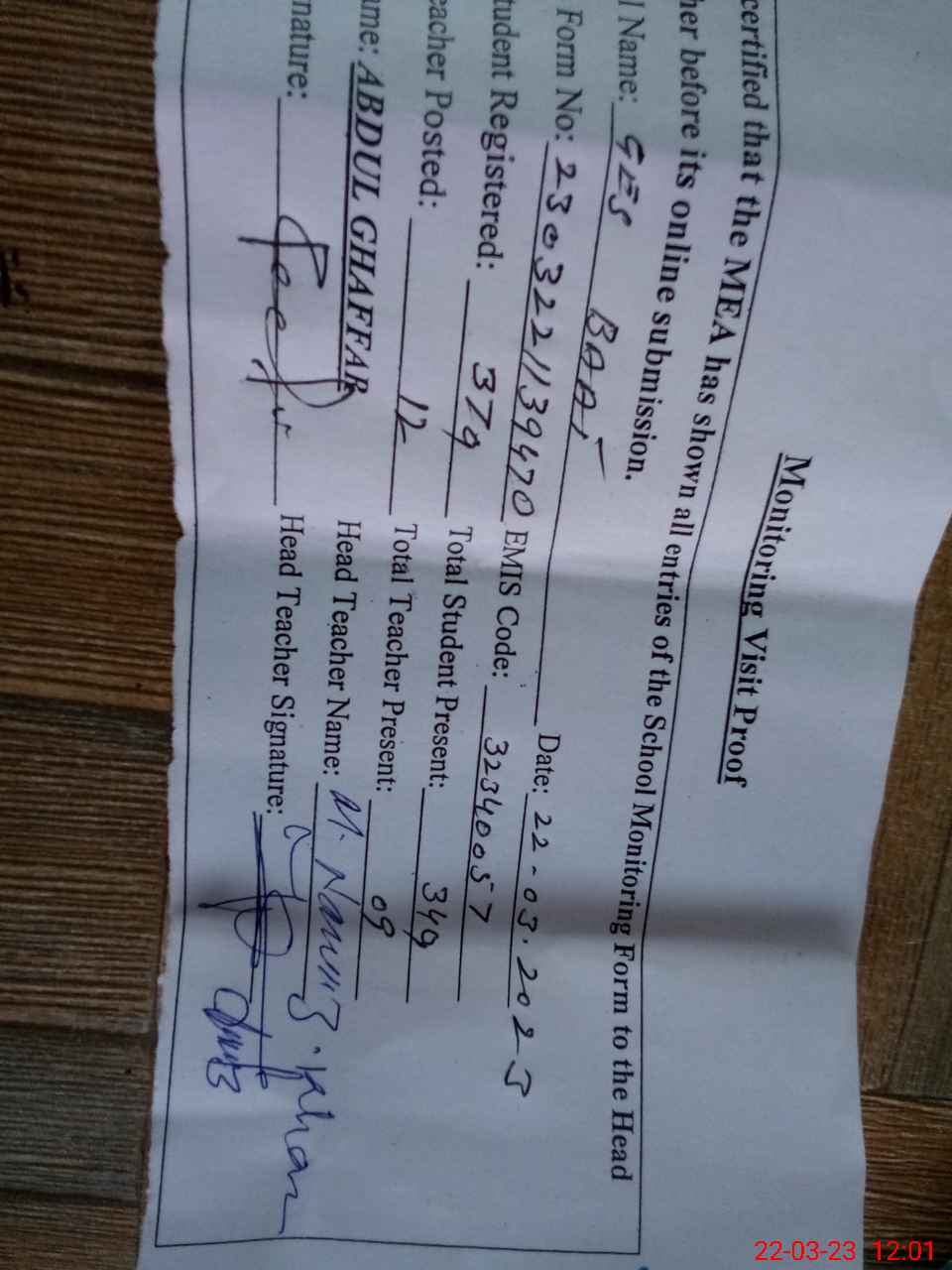 | Name: Mu**** Ta**** Designation: (School Headmaster's/Headmistress's) S S T Phone/Cell Number: 03**** |