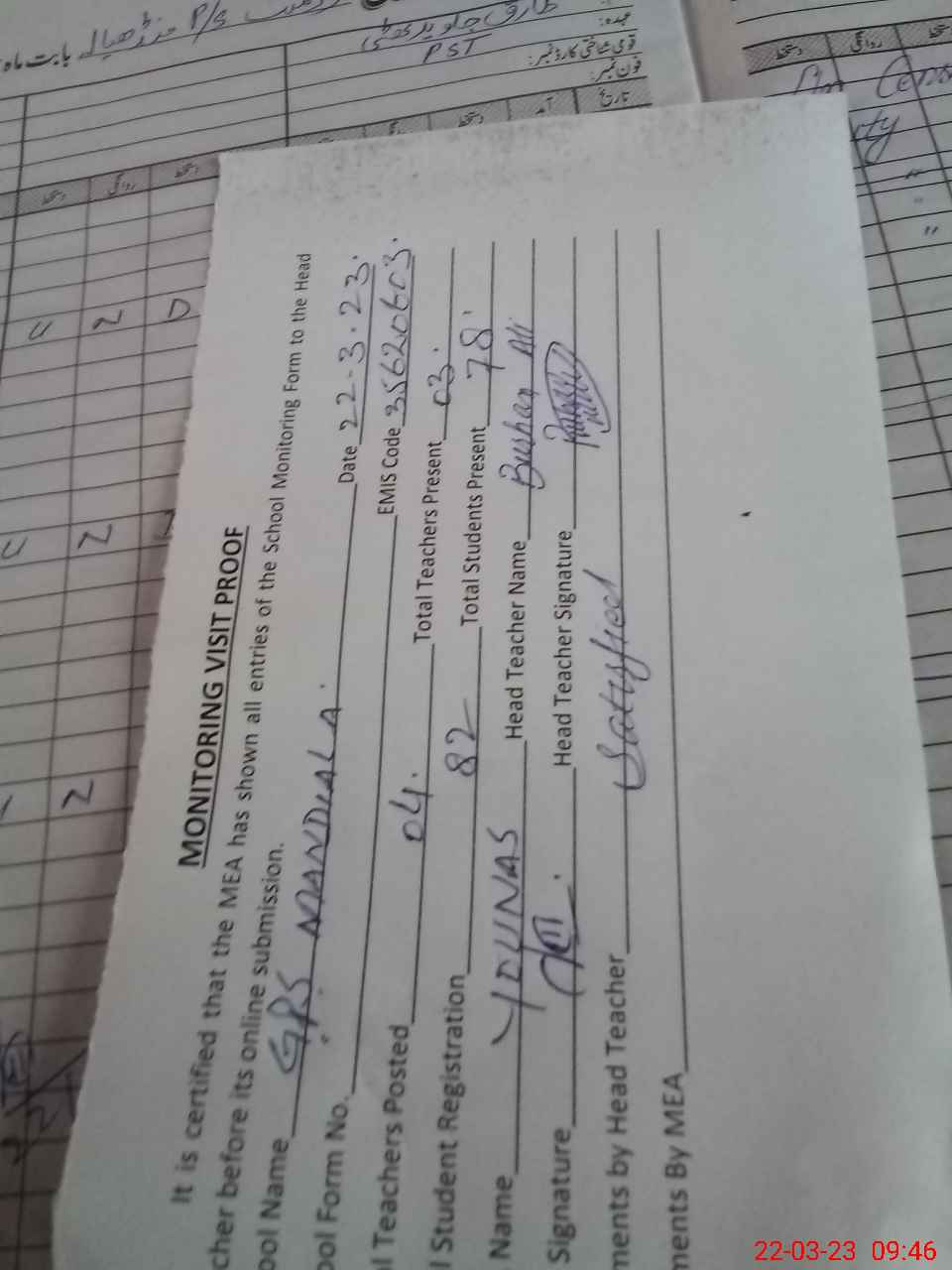 | EMIS Code: 35620603 | Name of School: GPS MANDIALA CHAK NO 20 RB | |||