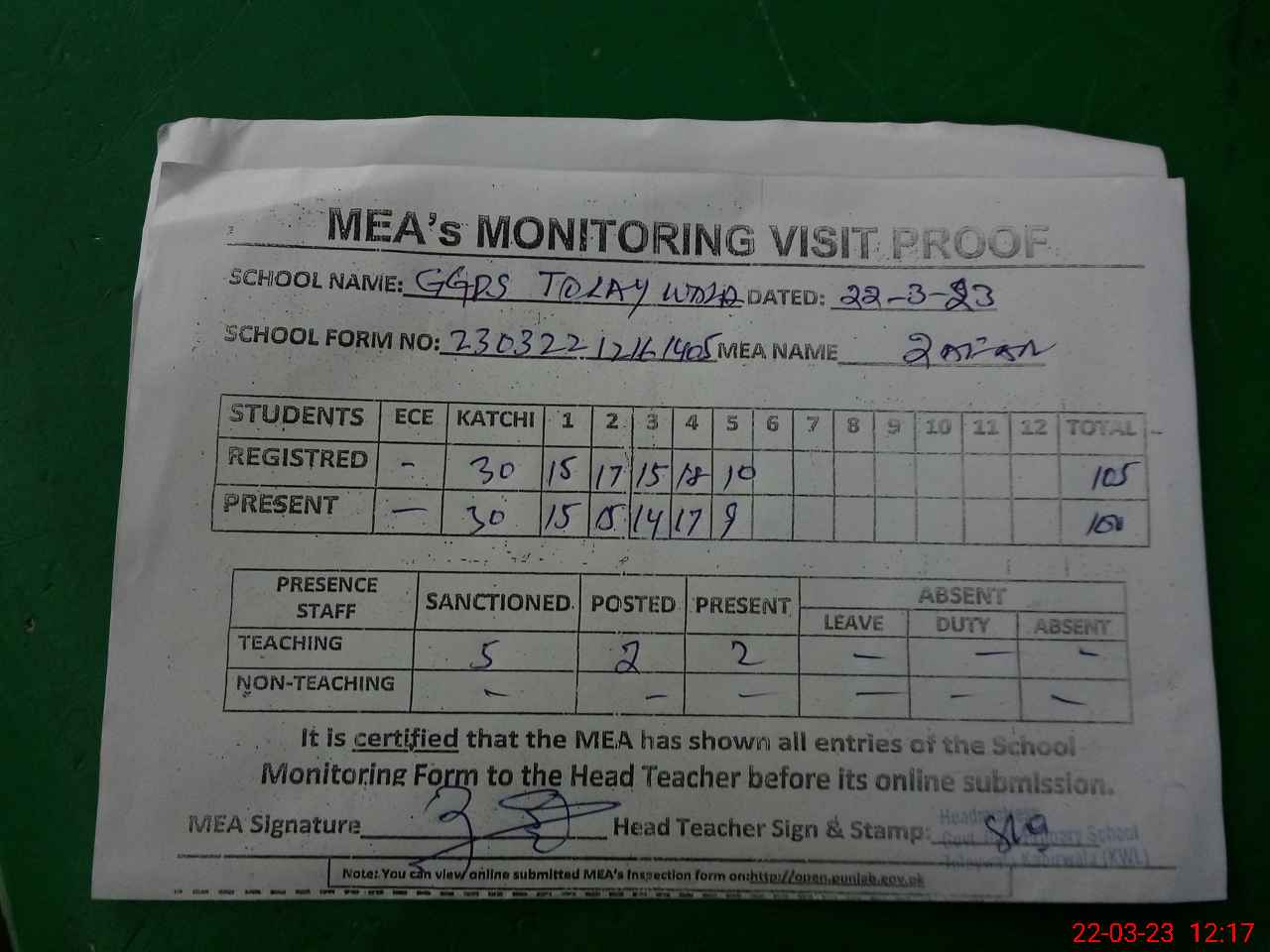 | Attendance Register | Head Teacher | MEA with School | Visit Proof |
