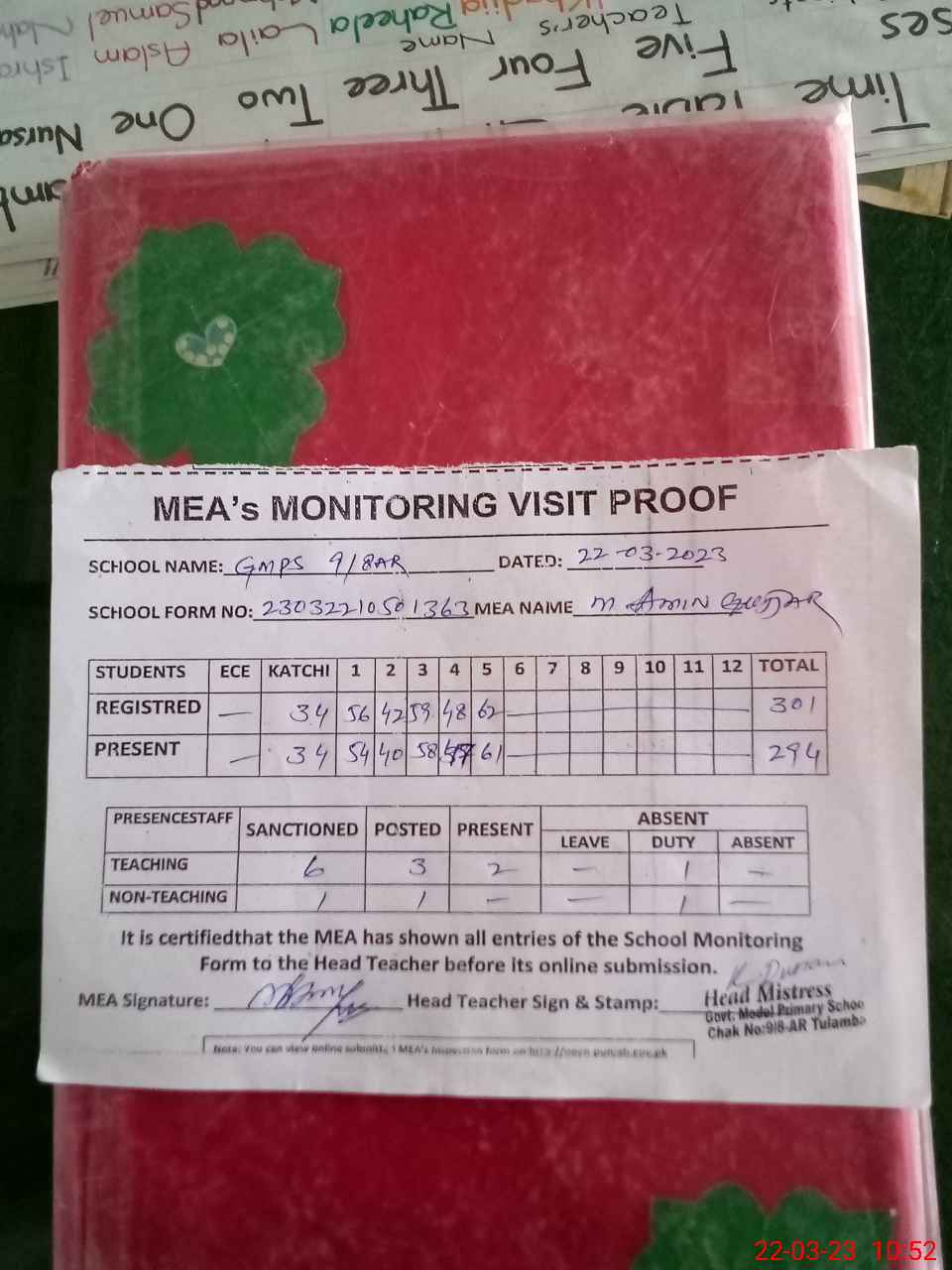 | Attendance Register | Head Teacher | MEA with School | Visit Proof |