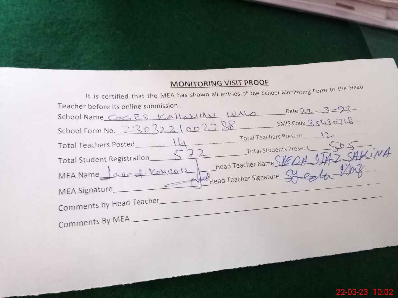 | Attendance Register | Head Teacher | MEA with School | Visit Proof |