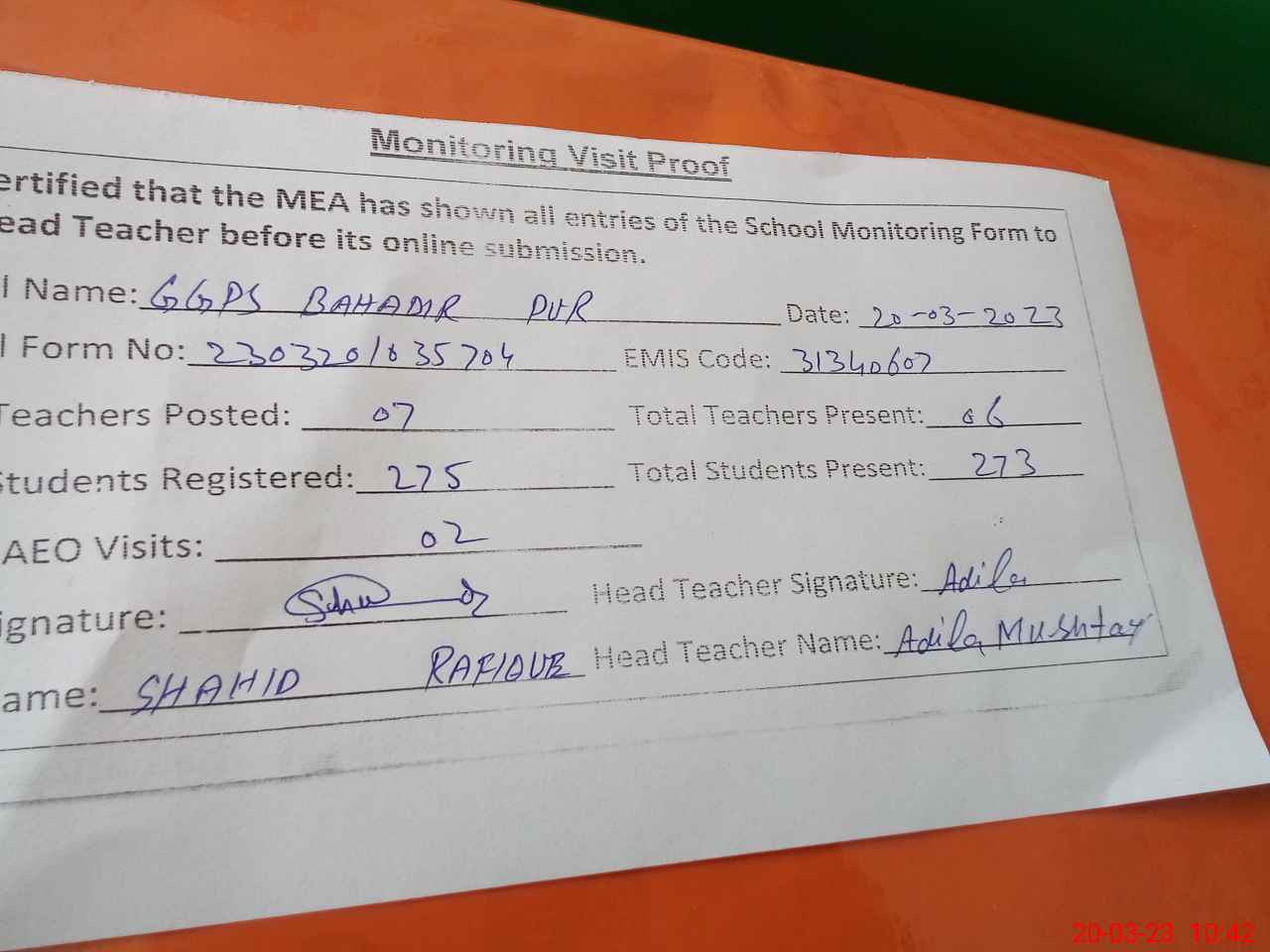 | EMIS Code: 31340607 | Name of School: GGPS CHOWK BAHADAR PUR | |||