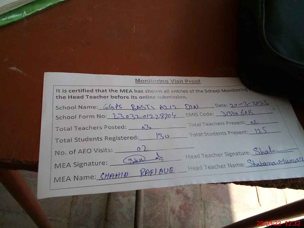 | Attendance Register | Head Teacher | MEA with School | Visit Proof |