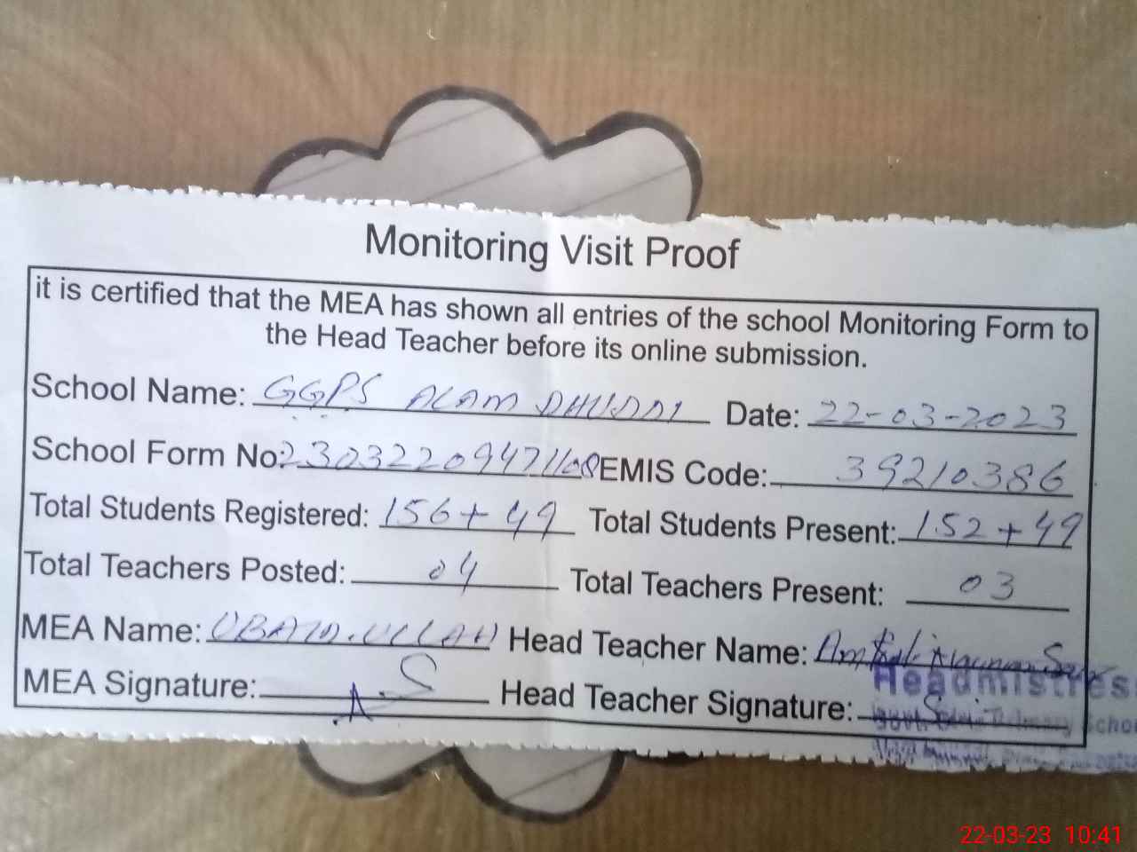| Attendance Register | Head Teacher | MEA with School | Visit Proof |