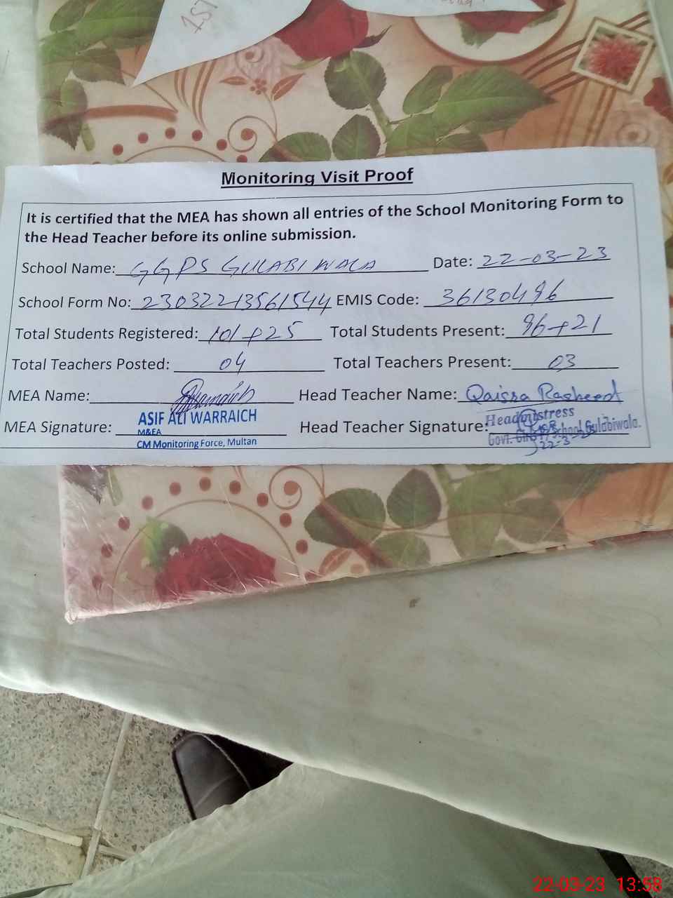 | Attendance Register | Head Teacher | MEA with School | Visit Proof |
