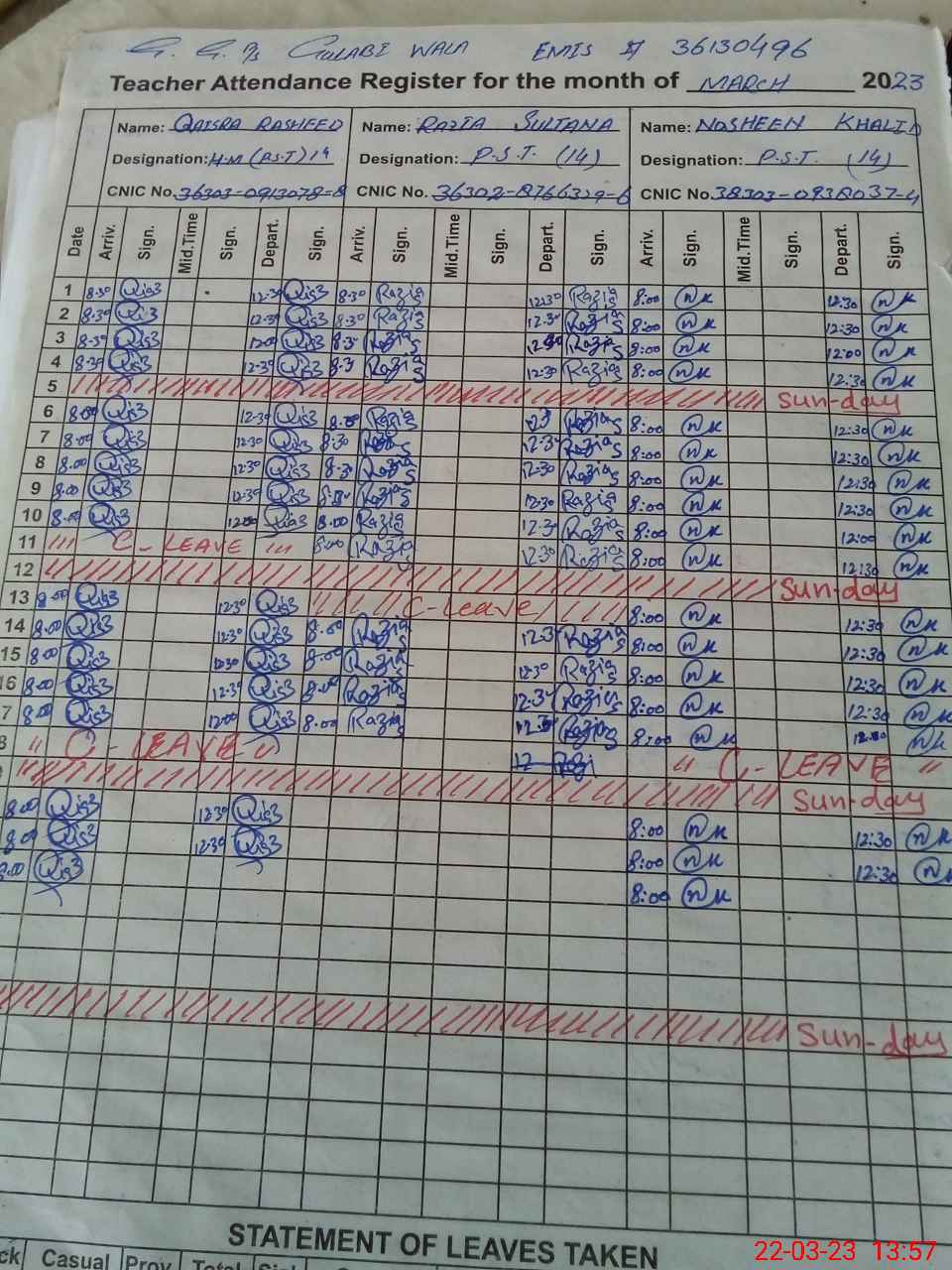 | CNIC | Full Name | Designation | R/C | Absence During Last Calender Month |