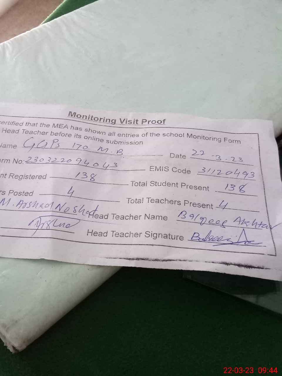 | Attendance Register | Head Teacher | MEA with School | Visit Proof |