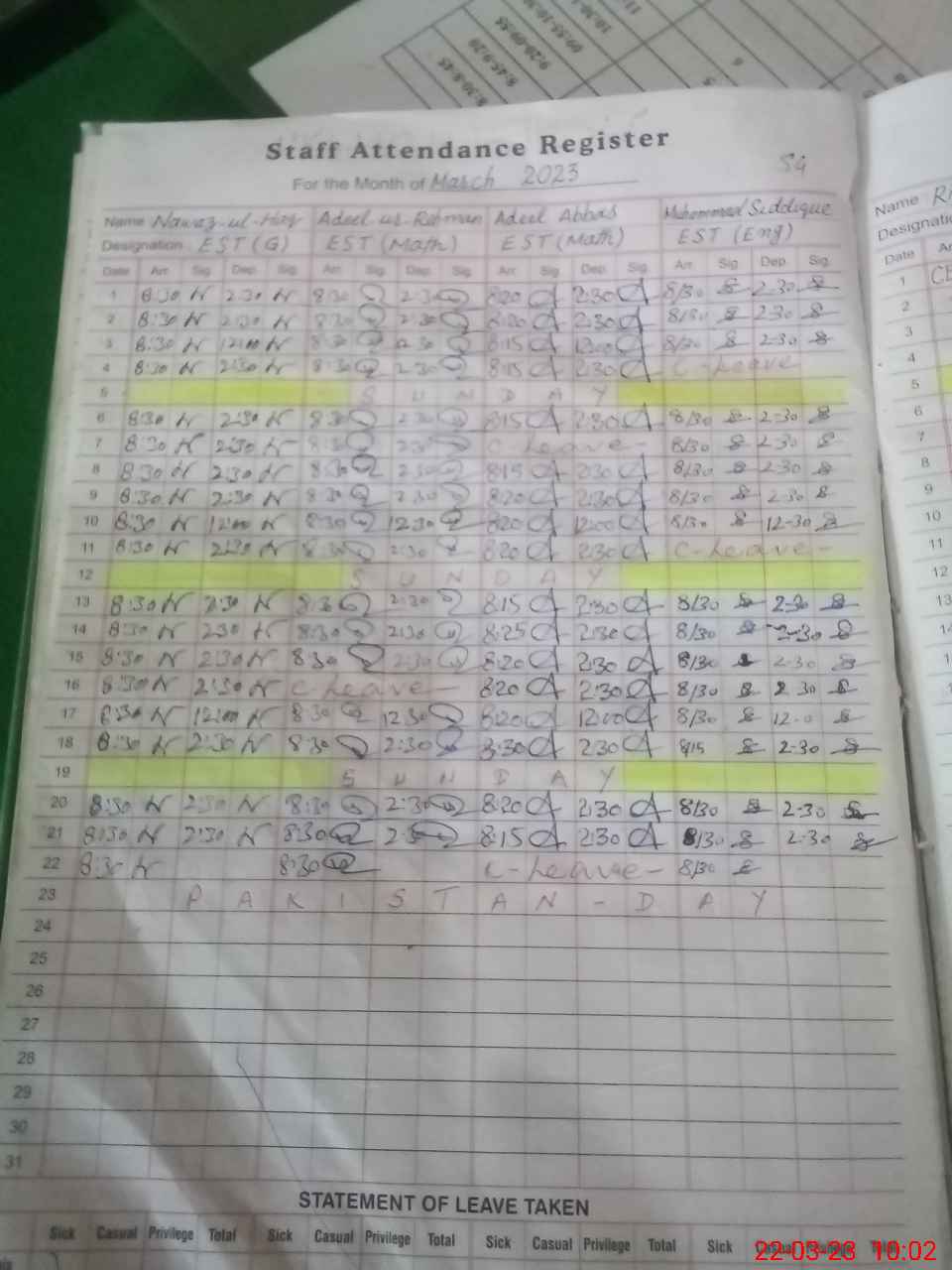 | Leave | Duty | Absent | Maternity | Medical | Ex- Pak |