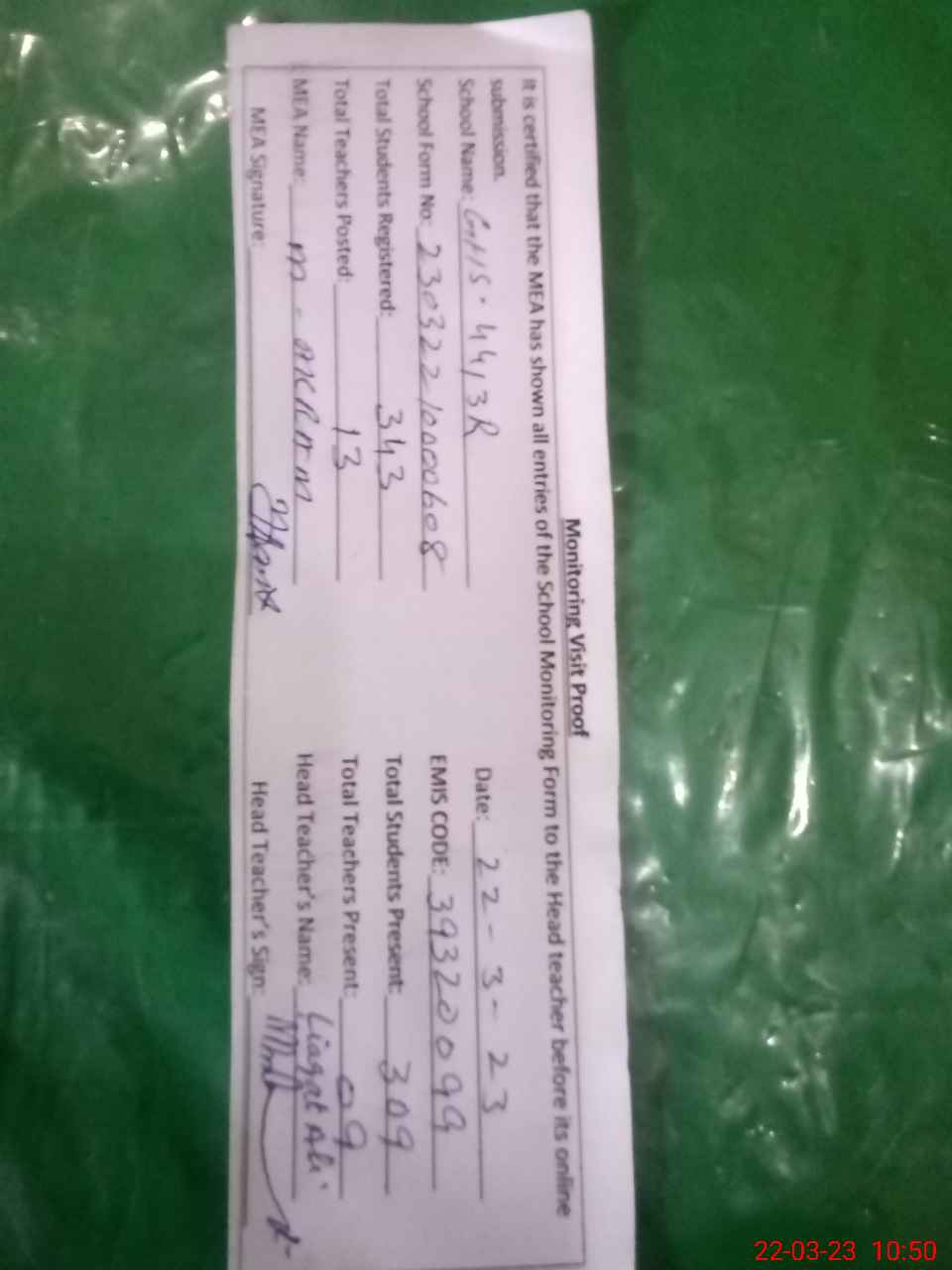 | Attendance Register | Head Teacher | MEA with School | Visit Proof |
