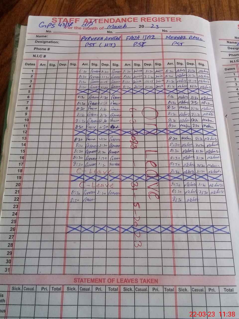 | CNIC | Full Name | Designation | R/C | Absence During Last Calender Month |