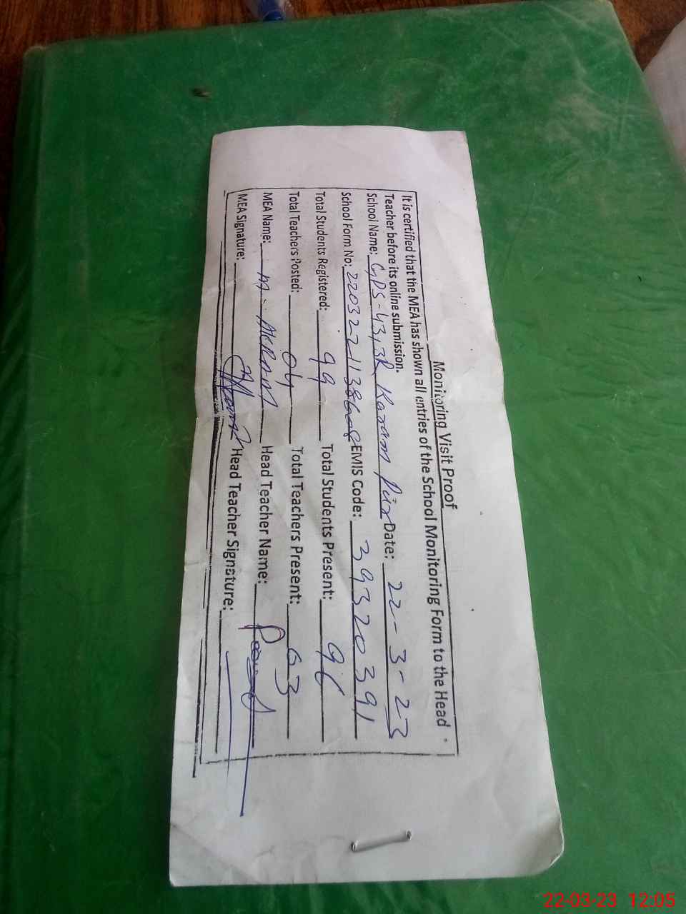 | Attendance Register | Head Teacher | MEA with School | Visit Proof |