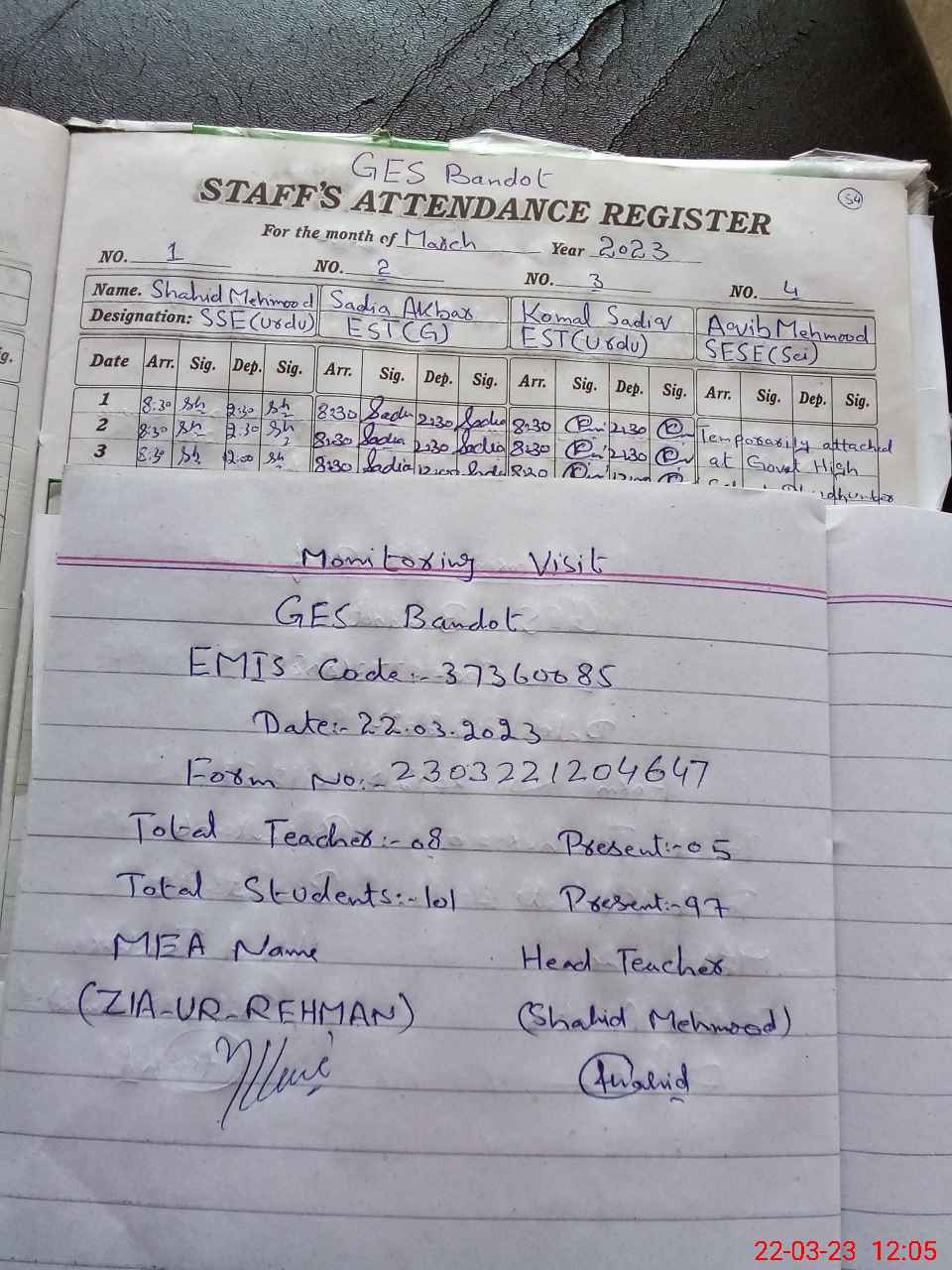 | Attendance Register | Head Teacher | MEA with School | Visit Proof |
