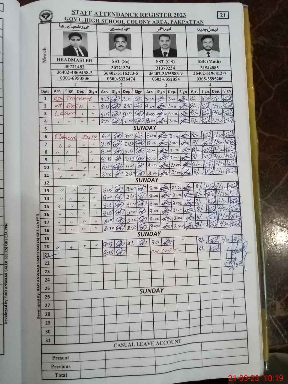 | Name: SA**** HU**** Designation: (School Headmaster's/Headmistress's) HEADMASTER Phone/Cell Number: 03**** |
