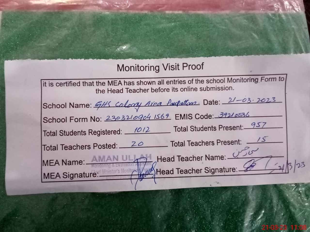 | EMIS Code: 39210036 | Name of School: GHS COLONY AREA PAKPATTAN | |||