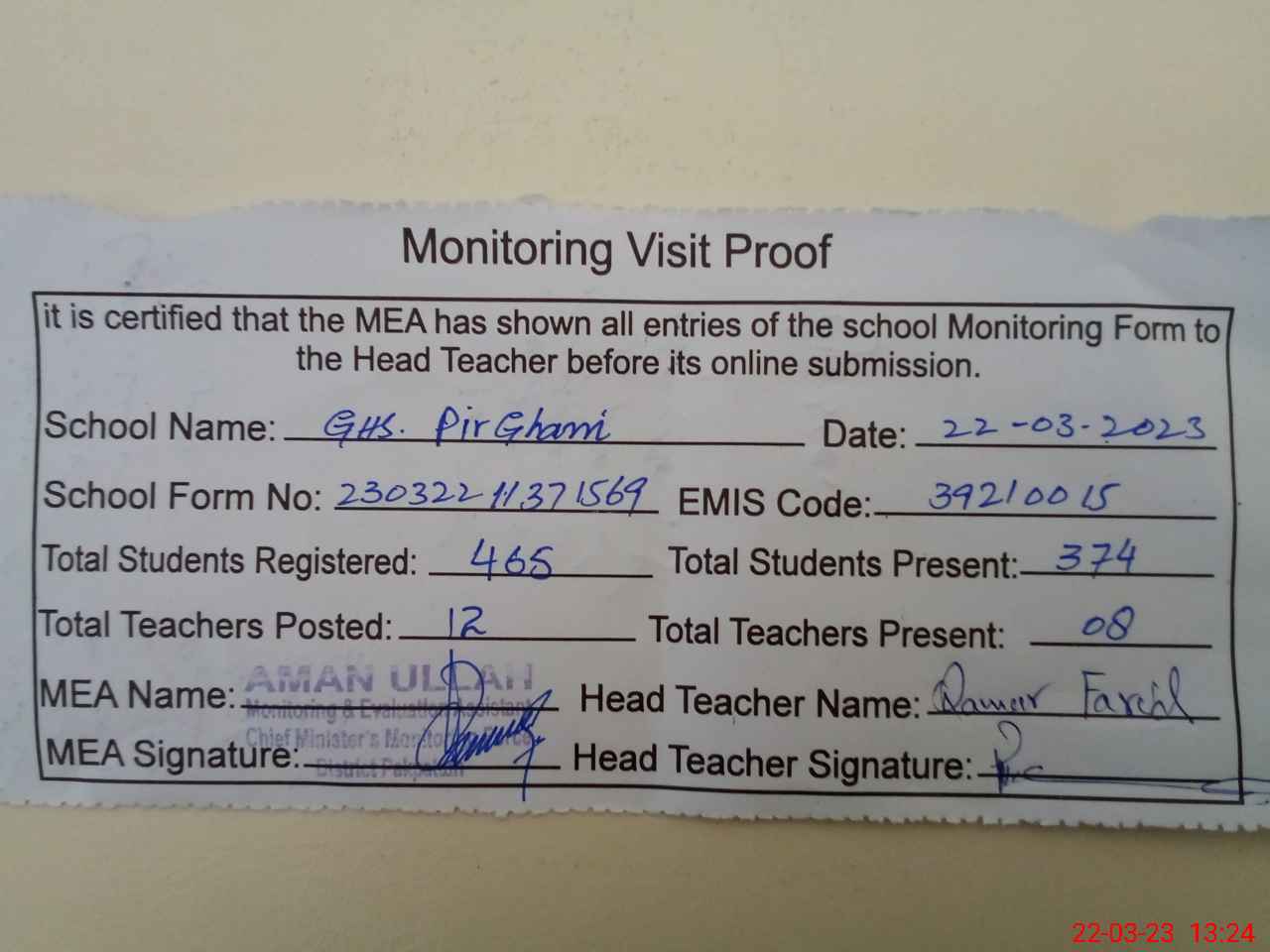 | EMIS Code: 39210015 | Name of School: GHS PEER GHANI | |||