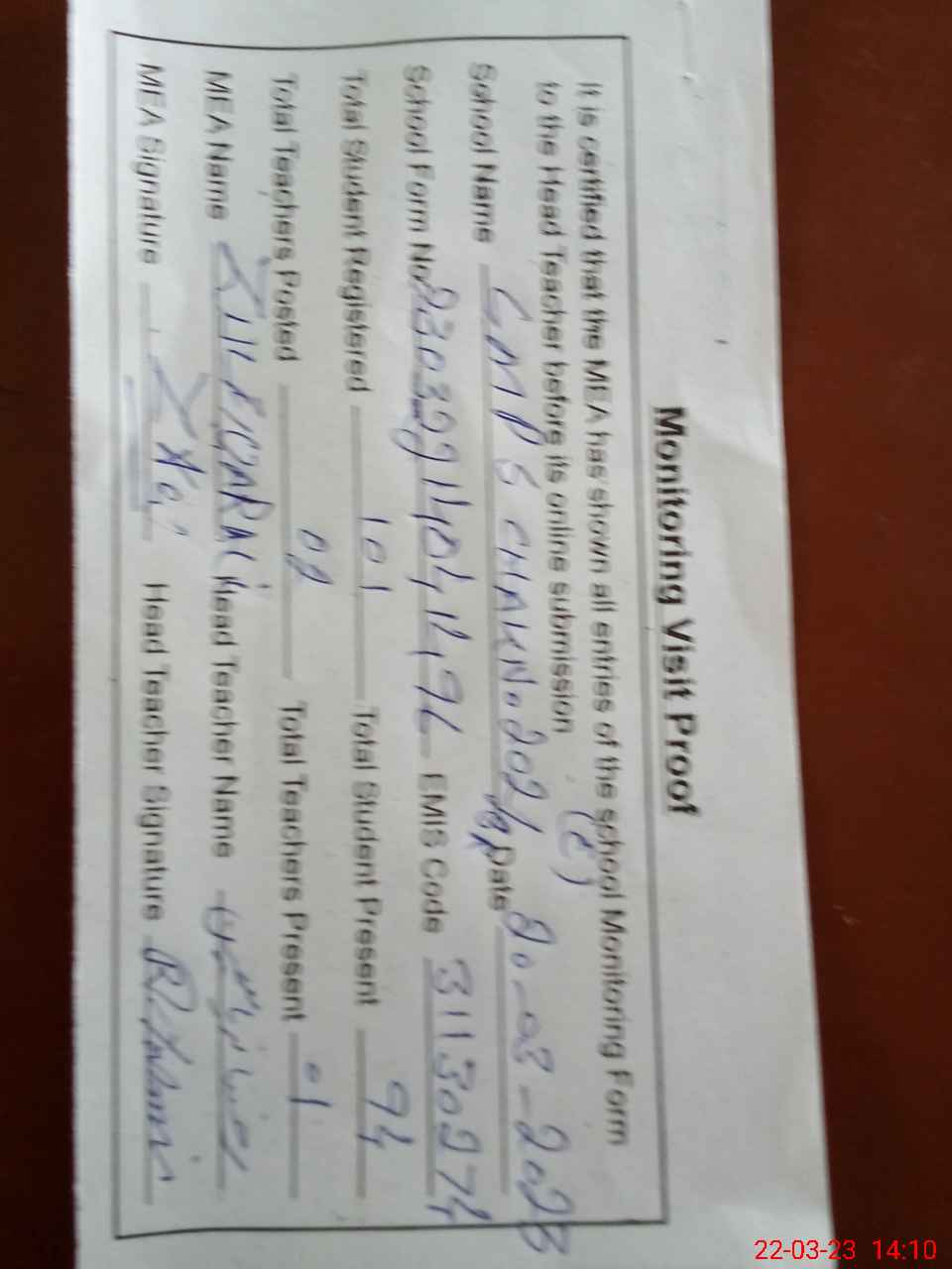 | Attendance Register | Head Teacher | MEA with School | Visit Proof |