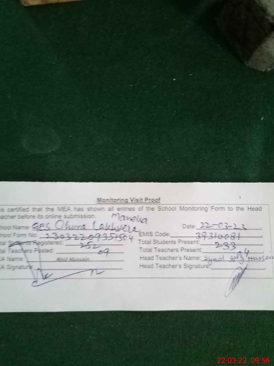 | Attendance Register | Head Teacher | MEA with School | Visit Proof |