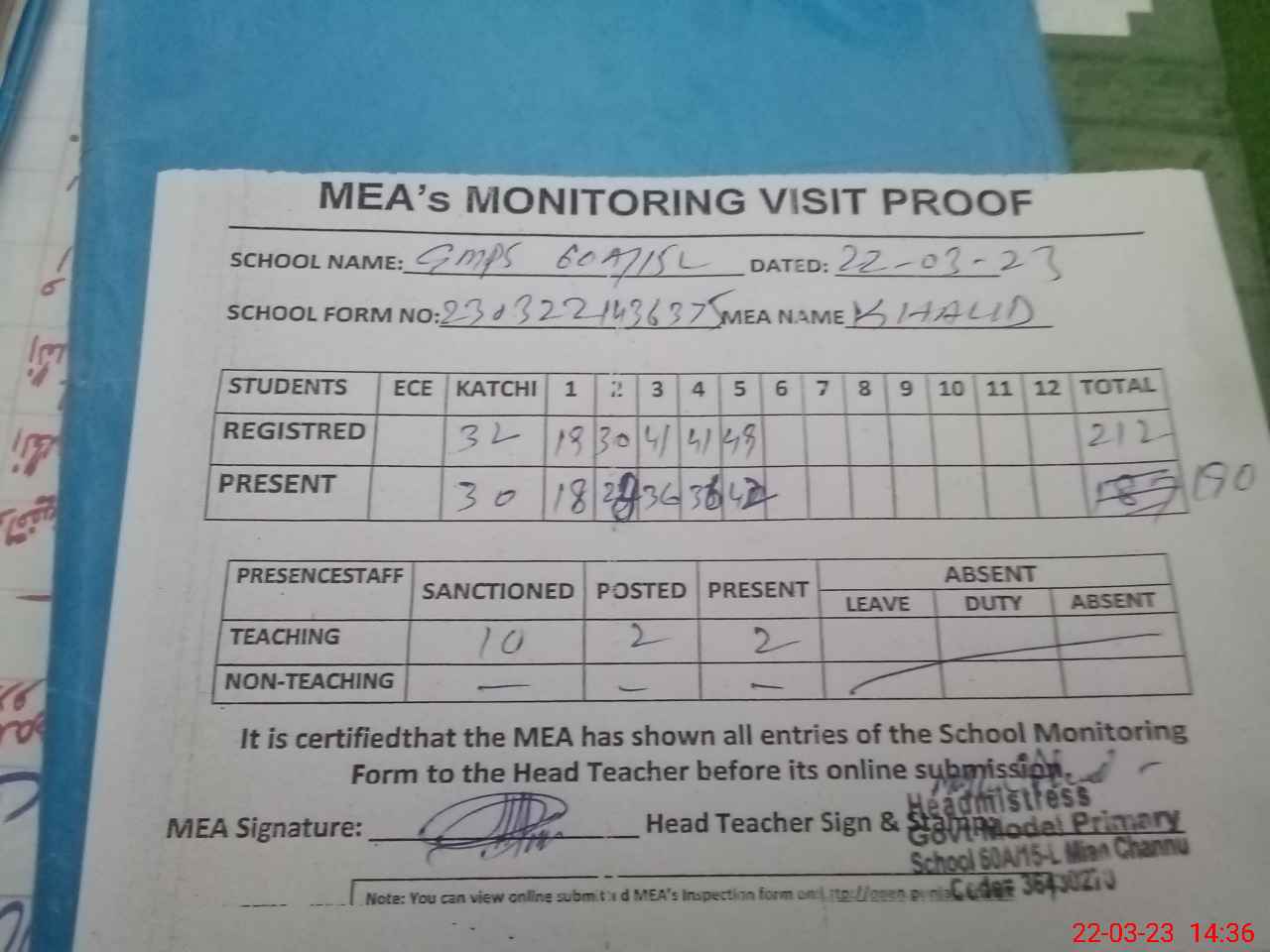 | Attendance Register | Head Teacher | MEA with School | Visit Proof |