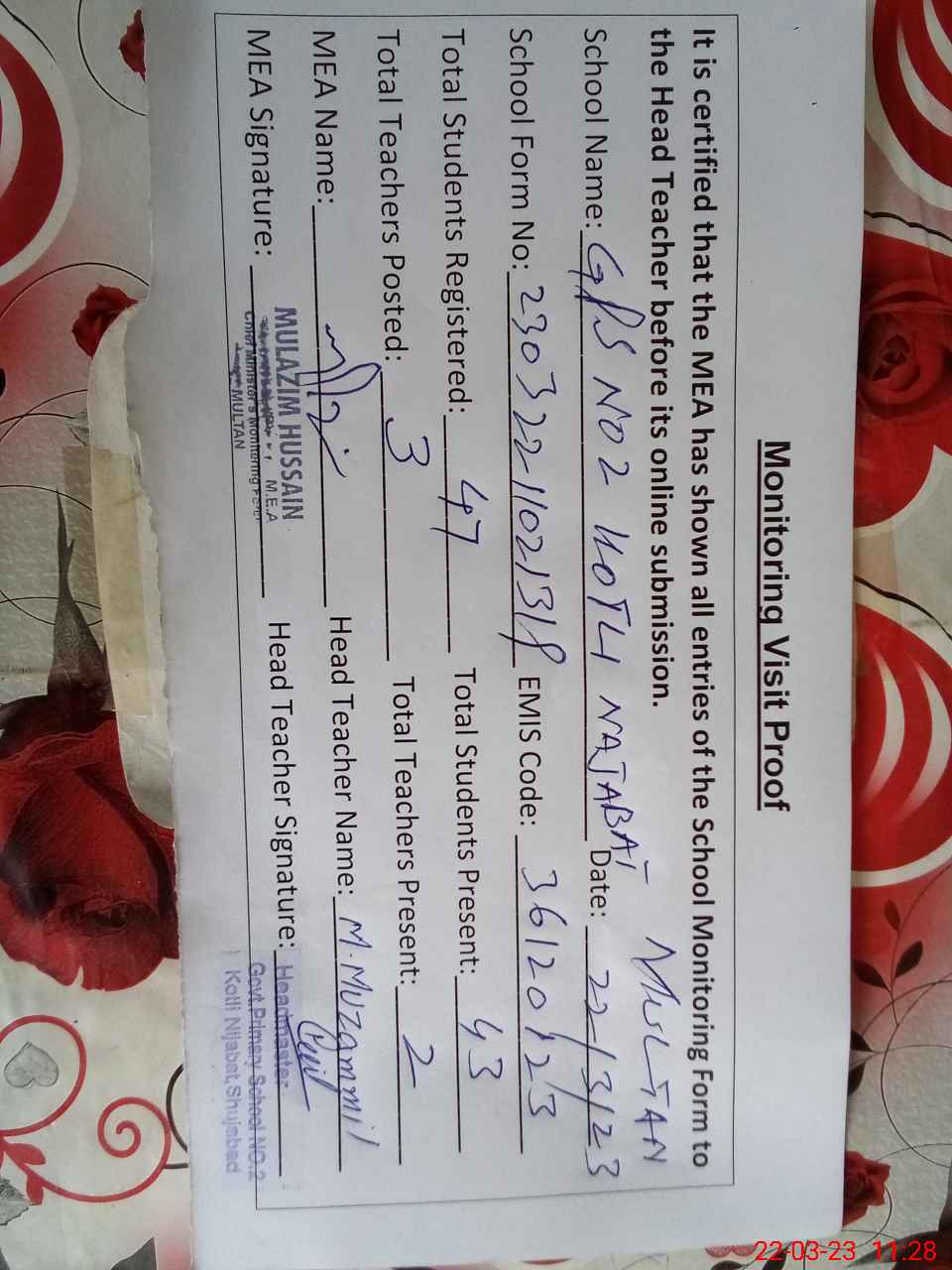 | Attendance Register | Head Teacher | MEA with School | Visit Proof |