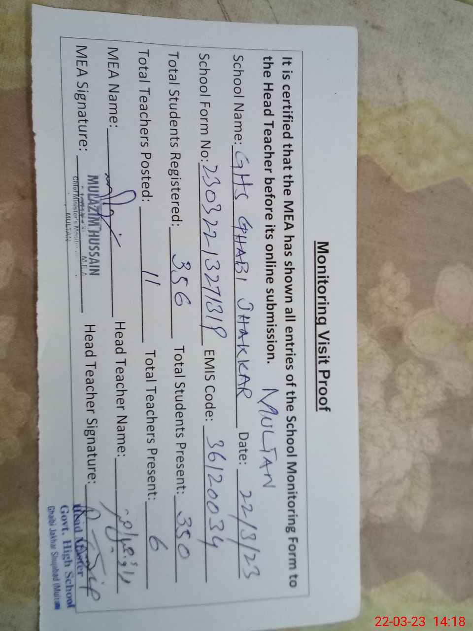 | EMIS Code: 36120034 | Name of School: GHS GHABI JHAKKAR SHUJABAD | |||