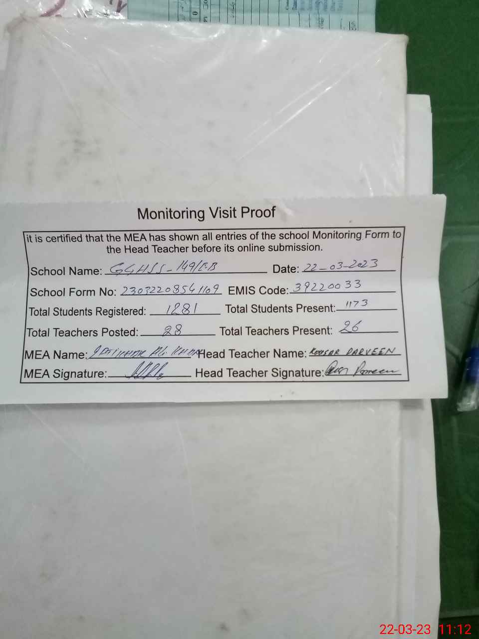 | EMIS Code: 39220033 | Name of School: GGHSS 149 EB ARIFWALA | |||
