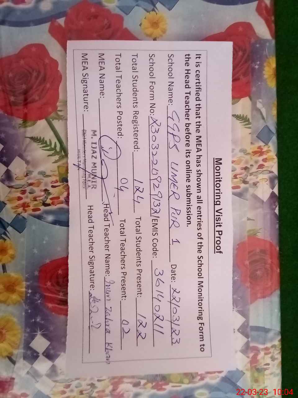 | Attendance Register | Head Teacher | MEA with School | Visit Proof |