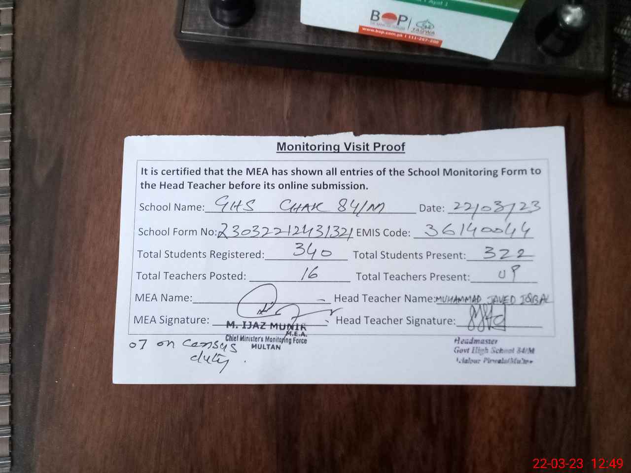 | Name: MU**** JA**** IQ**** Designation: (School Headmaster's/Headmistress's) HEAD MASTER Phone/Cell Number: 03**** |