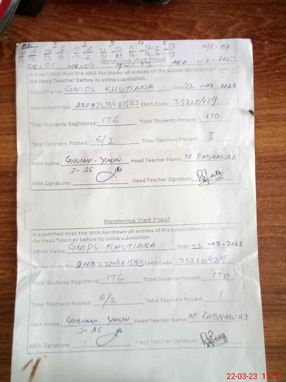 | Attendance Register | Head Teacher | MEA with School | Visit Proof |
