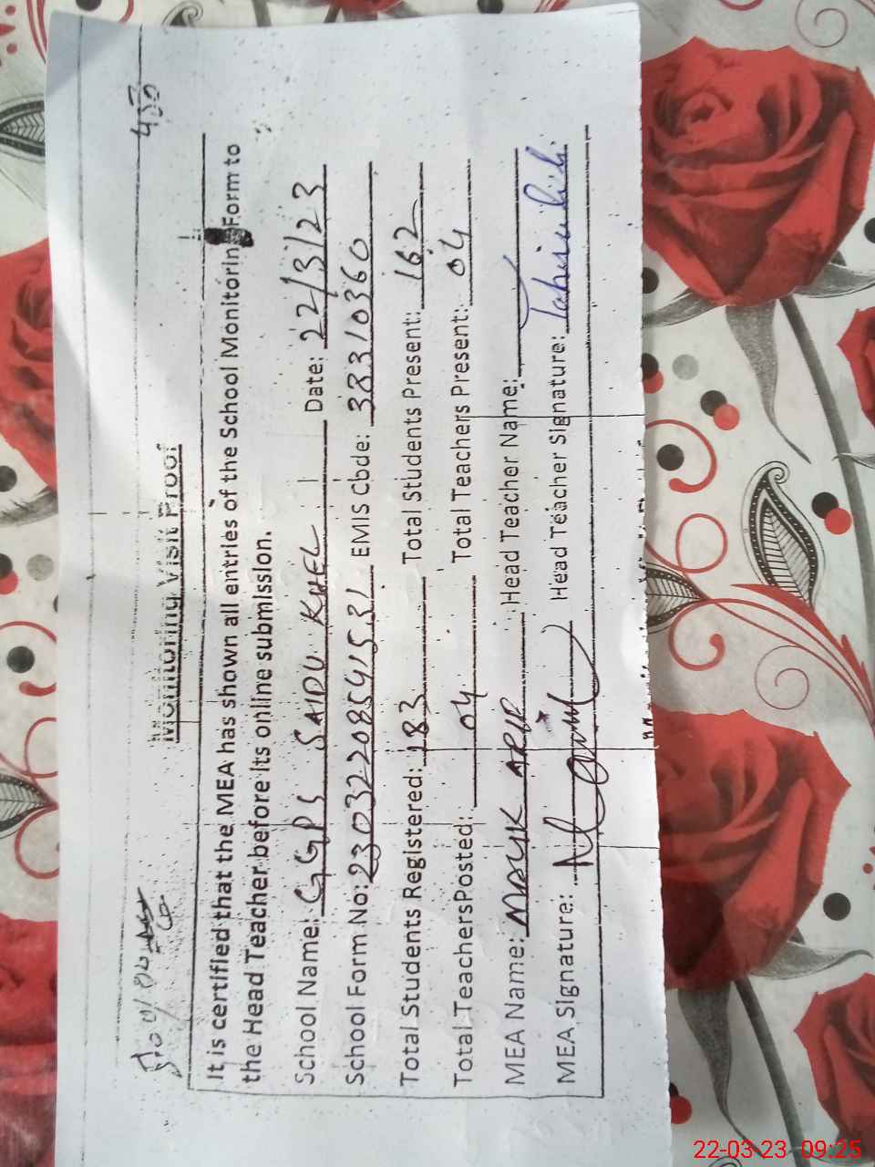 | Attendance Register | Head Teacher | MEA with School | Visit Proof |