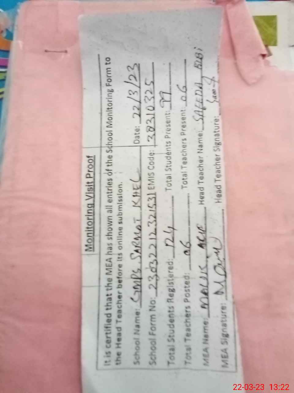 | Attendance Register | Head Teacher | MEA with School | Visit Proof |