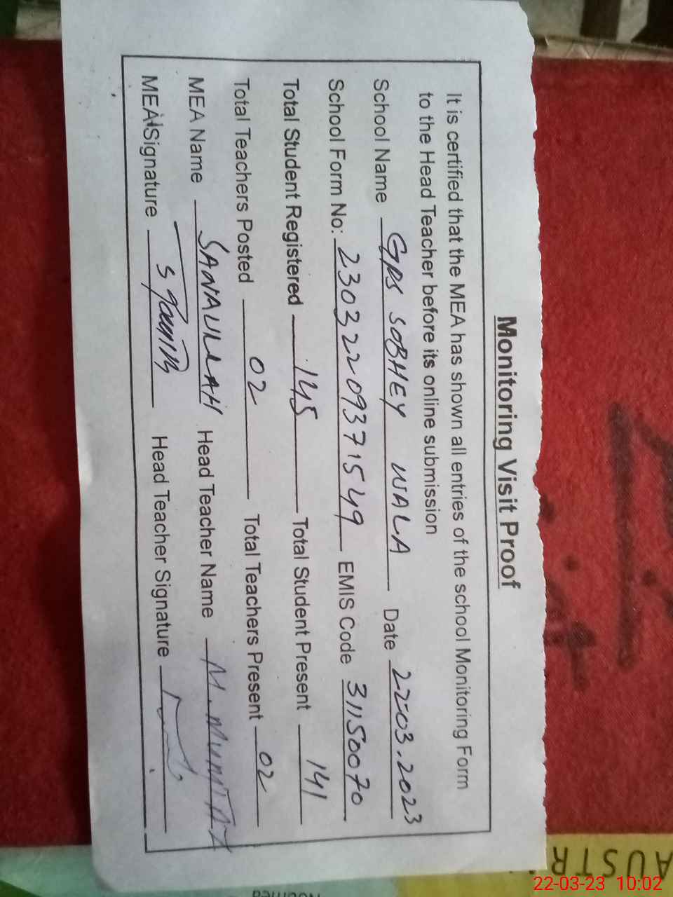 | Attendance Register | Head Teacher | MEA with School | Visit Proof |