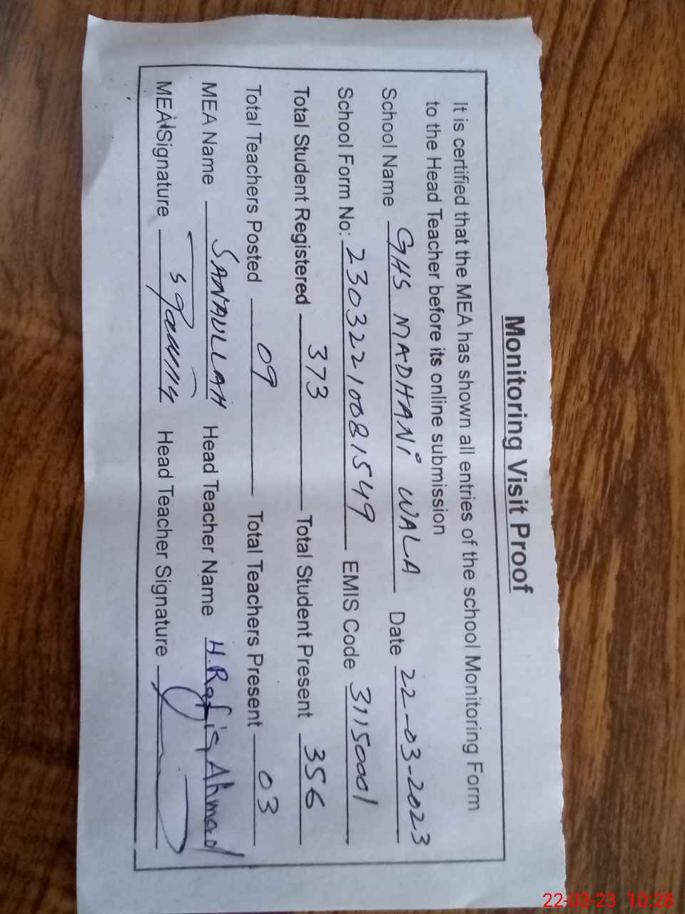 | EMIS Code: 31150001 | Name of School: GHS MADHANI WALA MINCHIN ABAD | |||