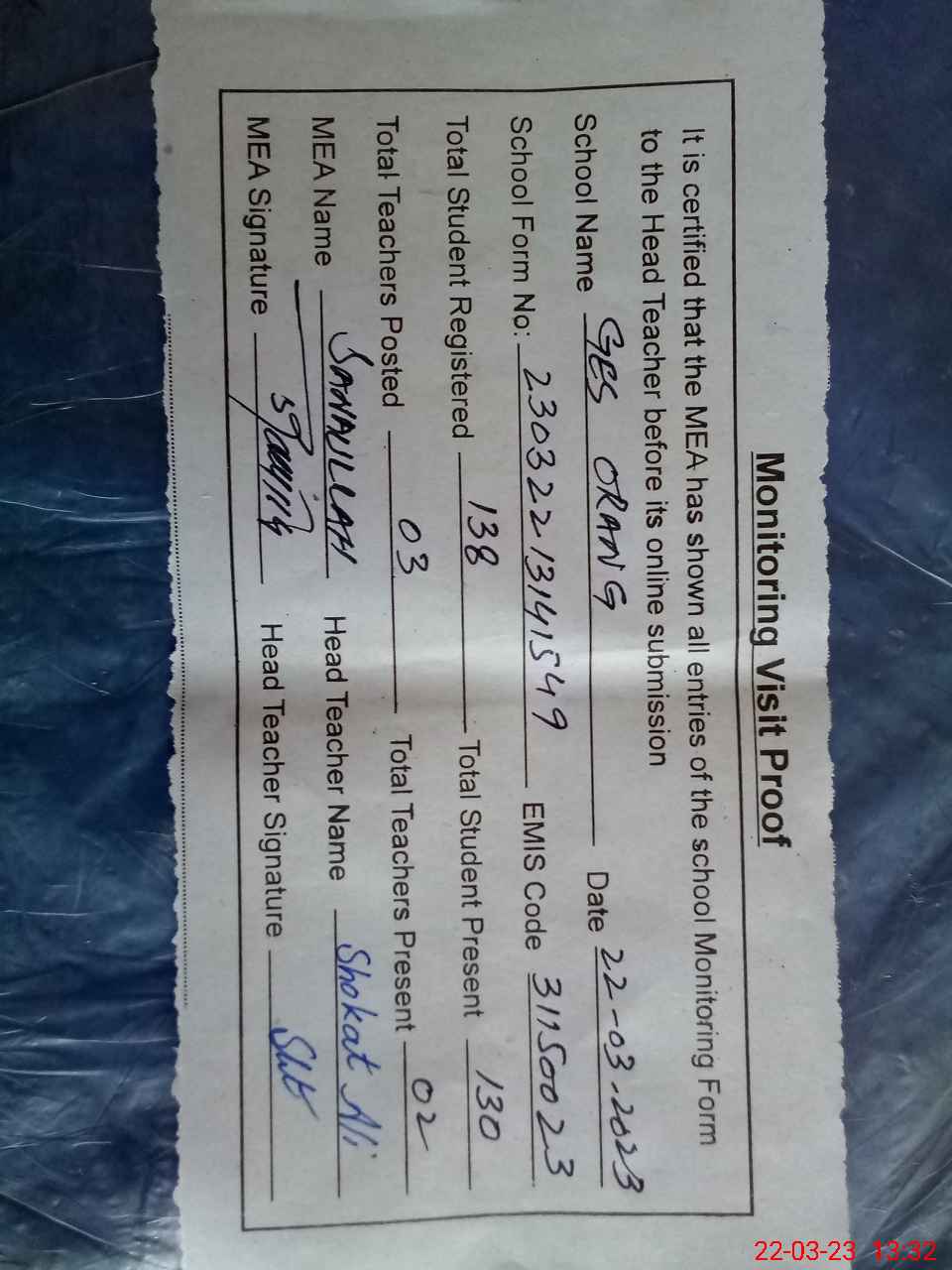 | Attendance Register | Head Teacher | MEA with School | Visit Proof |