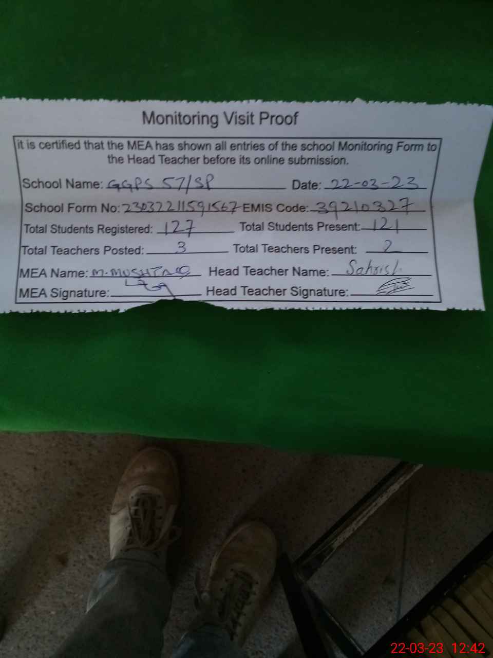 | Attendance Register | Head Teacher | MEA with School | Visit Proof |