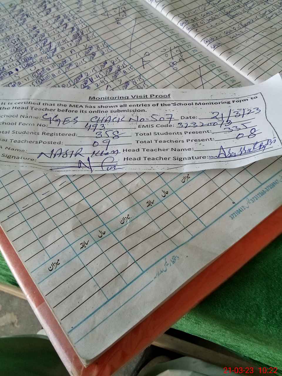 | EMIS Code: 32320073 | Name of School: GGHS CHAK NO. 507 TDA | |||
