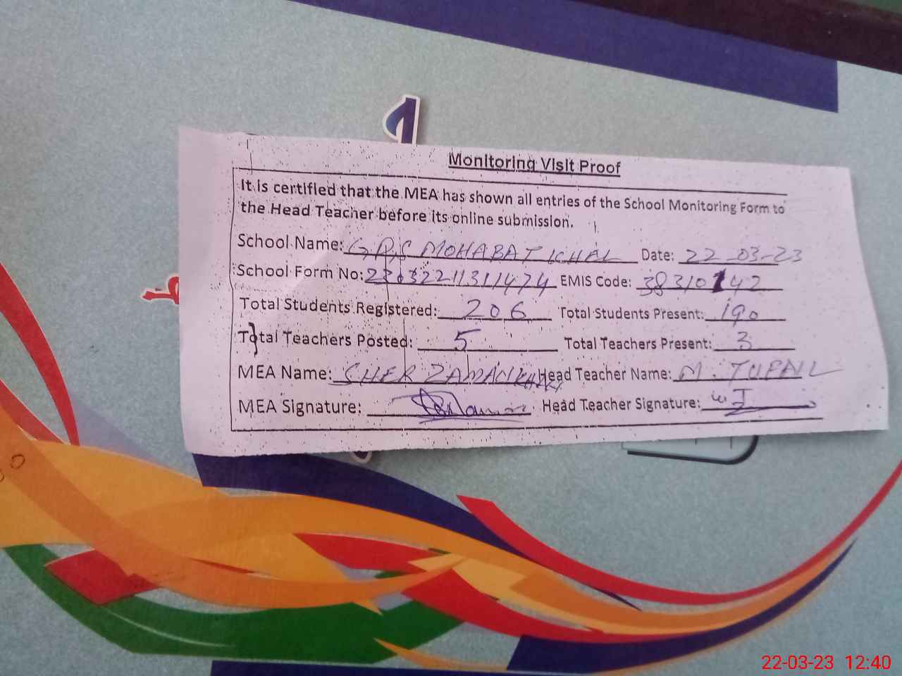 | Attendance Register | Head Teacher | MEA with School | Visit Proof |