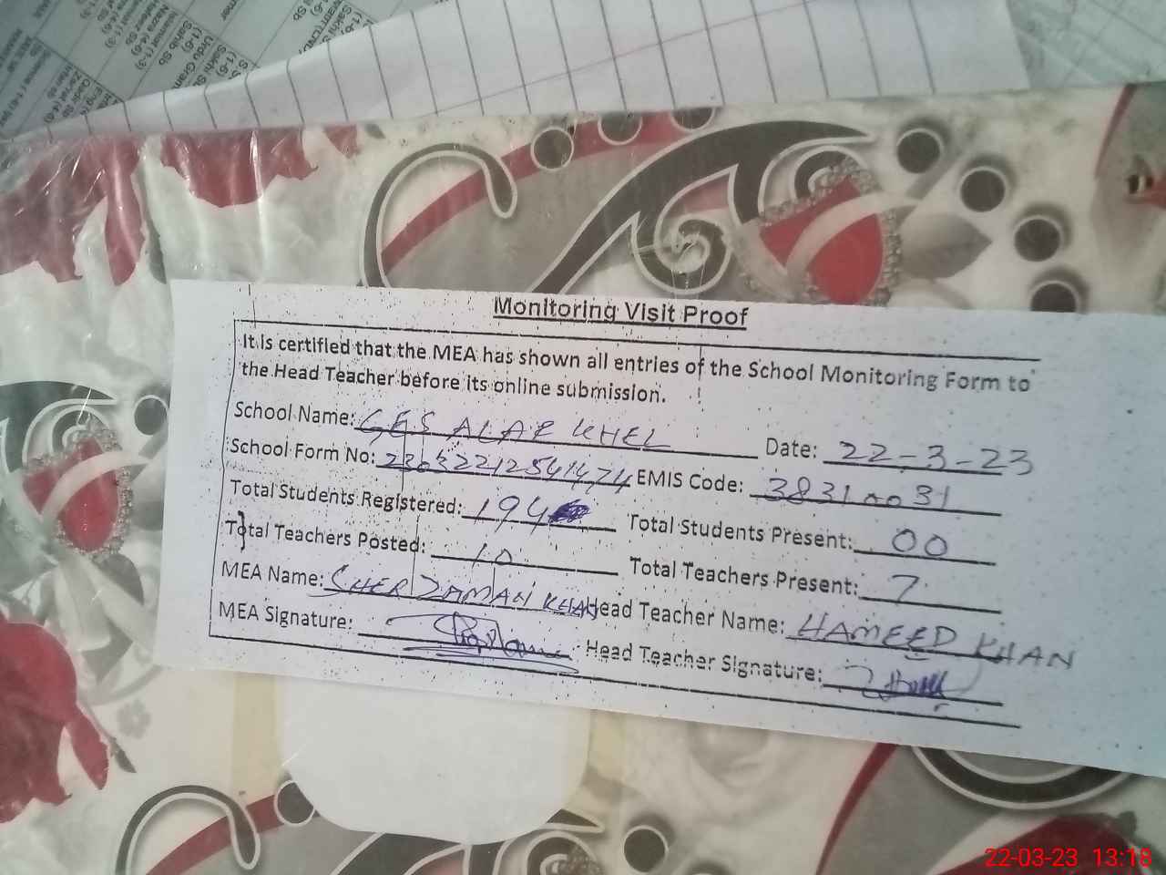 | Attendance Register | Head Teacher | MEA with School | Visit Proof |
