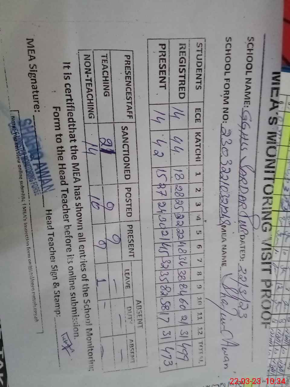 | Monitoring Date: 22-03-2023 | Start Time: 22-03-2023 09:20 AM | End Time: 22-03-2023 10:34 AM | Name of MEA: SH**** AH**** | |