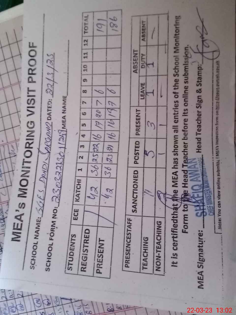 | Attendance Register | Head Teacher | MEA with School | Visit Proof |
