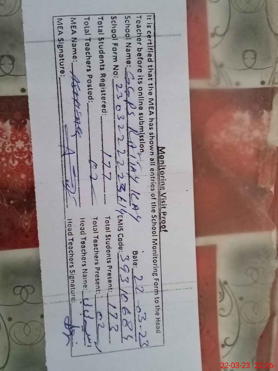 | Attendance Register | Head Teacher | MEA with School | Visit Proof |