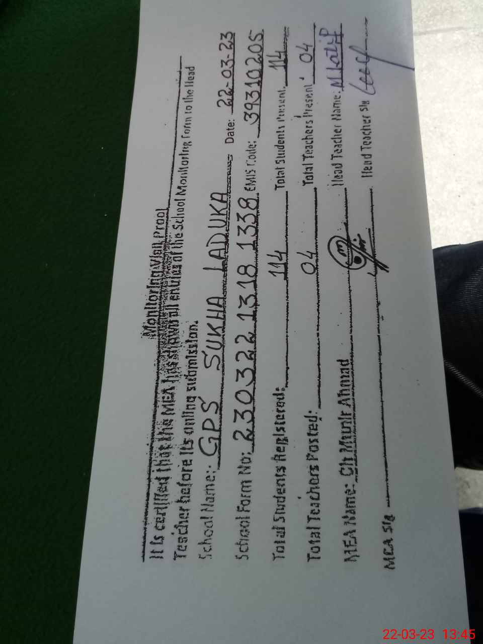 | Name: MO**** LA**** SH**** Designation: (School Headmaster's/Headmistress's) EST Phone/Cell Number: 03**** |