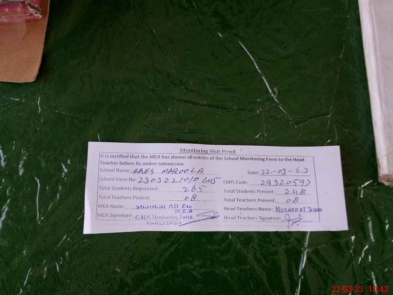 | Monitoring Date: 22-03-2023 | Start Time: 22-03-2023 10:10 AM | End Time: 22-03-2023 10:44 AM | Name of MEA: SH**** AL**** ZI**** (R**** | |